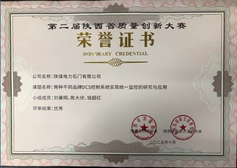 陜煤石電:《兩種不同品牌DCS控制系統實現統一監控的研究與應用》獲陜西省質量創新大賽優秀獎